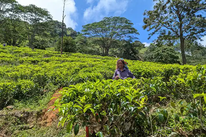 One of the highlights of this stage is the immersive walk through working tea plantations. As you move along the trail, you’ll pass rows of neatly trimmed tea bushes, colonial-era estate buildings, and tea pluckers going about their daily routines. These landscapes are not just visually striking but deeply connected to Sri Lanka’s history, as tea has shaped the region’s economy and culture for over a century.